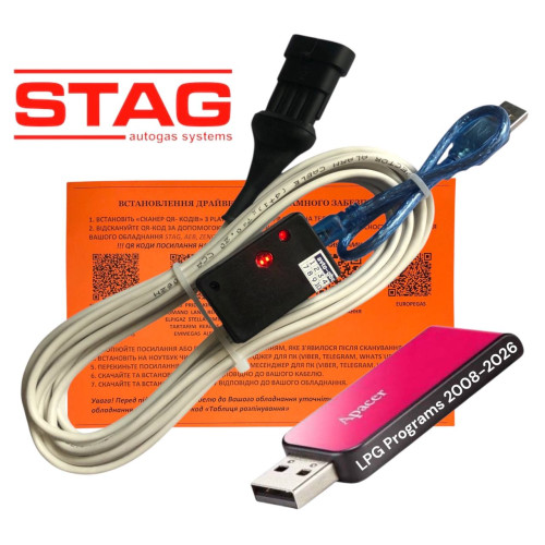- Комплект програмного забезпечення на USB-накопичувачі: У комплекті поставляється USB-накопичувач, що містить повний набір необхідних програм для діагностики та налаштування ГБО STAG, MRC, YOTA, LPGTECH, KME, DIGITRONIC, LOVATO, ATIKER, актуальних для СТО України з 2008 по 2026 рік, а також драйвери для кабелю.